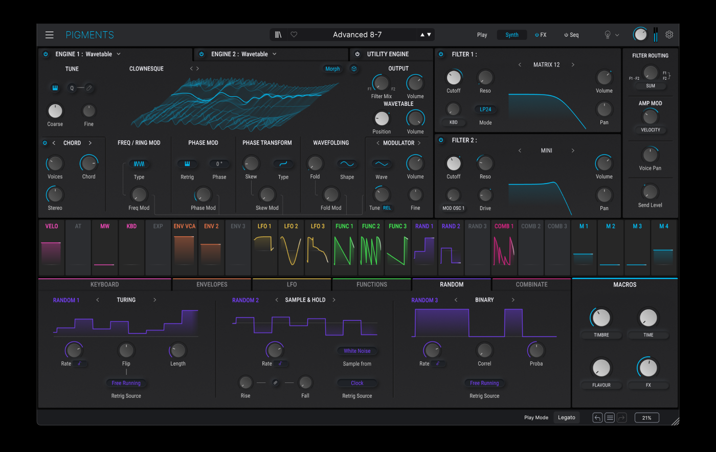 Pigments 5 integrates four powerful synthesis engines: wavetable, granular, harmonic additive, and virtual analog, allowing you to create everything from evolving pads to earth-shaking bass. With its dual-engine architecture, up to three oscillators per voice, and rich modulation options, you can explore boundless sonic landscapes. The innovative Utility Engine also enables seamless integration of external audio for unique sound manipulation.