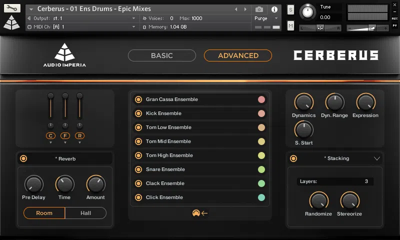 Unlike traditional drum libraries where you have to layer multiple instruments manually, Cerberus offers a stacking system that allows you to build massive drum ensembles instantly. This system lets you create anything from a small percussive group to a full-scale cinematic drum army.