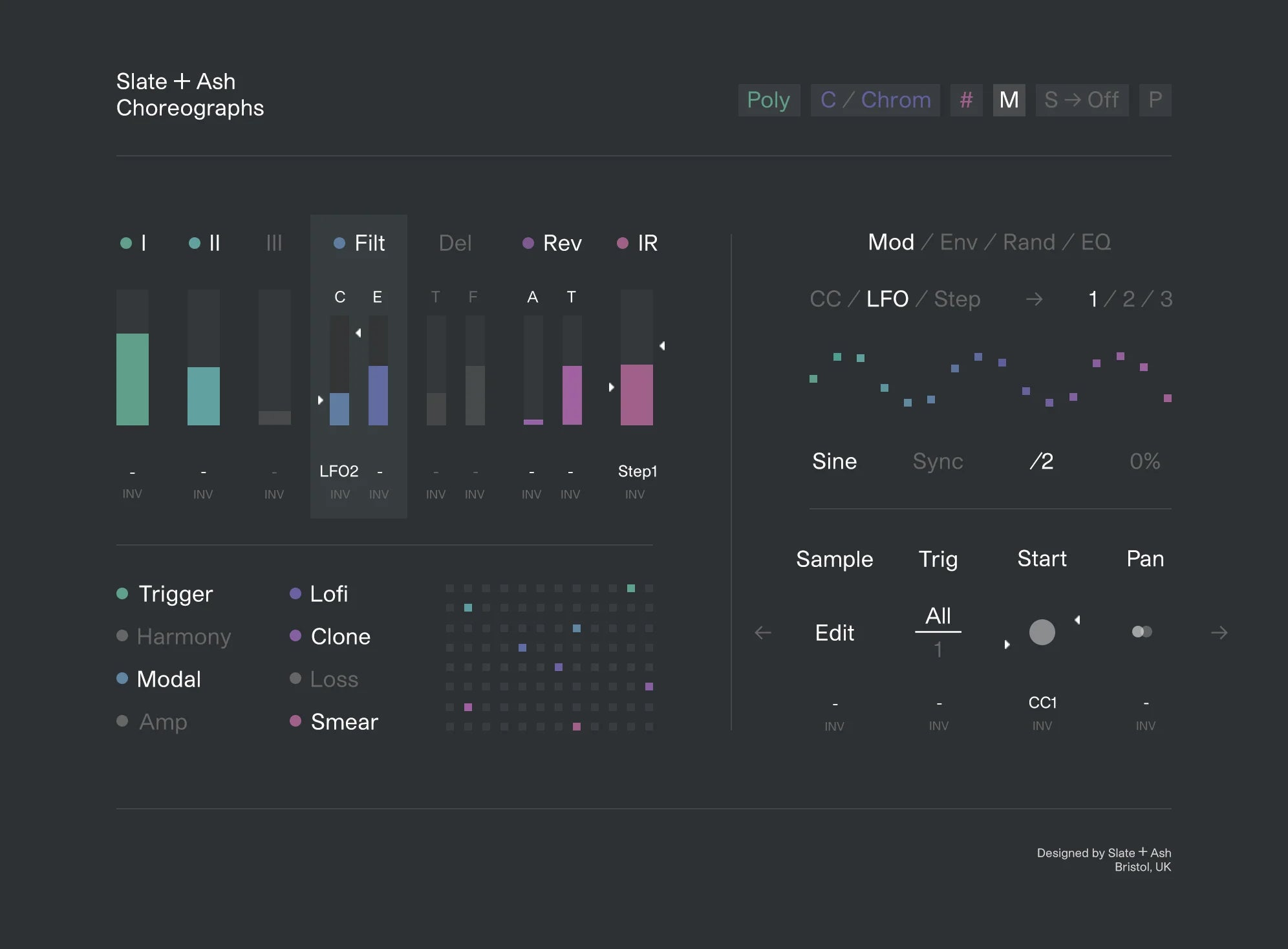 Choreographs Slate and Ash is a highly creative sound design tool built to capture the essence of motion and pattern. With over 150 modulatable controls, this instrument allows you to manipulate sound with unprecedented flexibility. By connecting sample-based oscillators with a sophisticated architecture of musical devices, Choreographs offers an expansive range of sonic possibilities—from polyphonic synthesizer to drum machine, sampler, and granular processor.