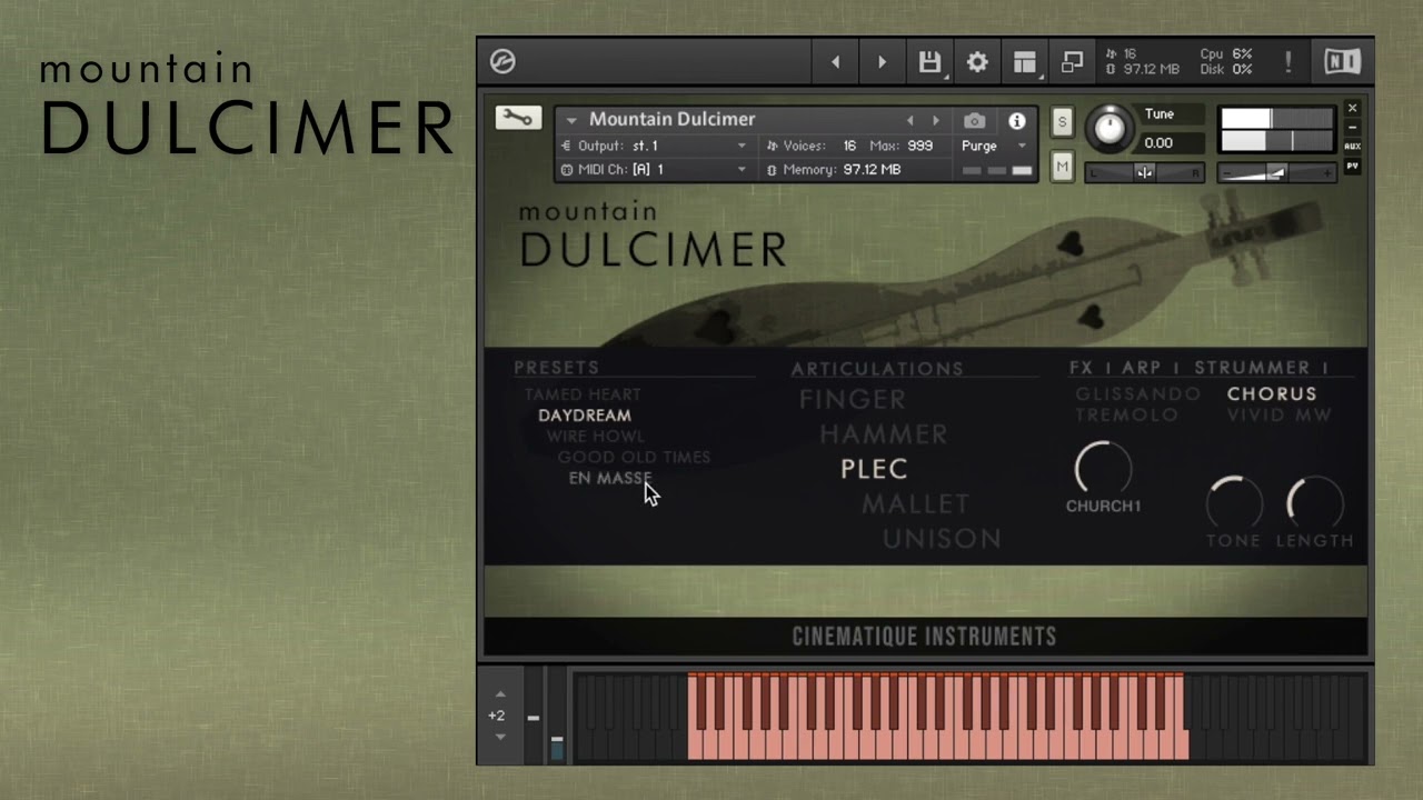 - Articulations: Finger-picked, Piano Hammer, Plectrum, Mallets