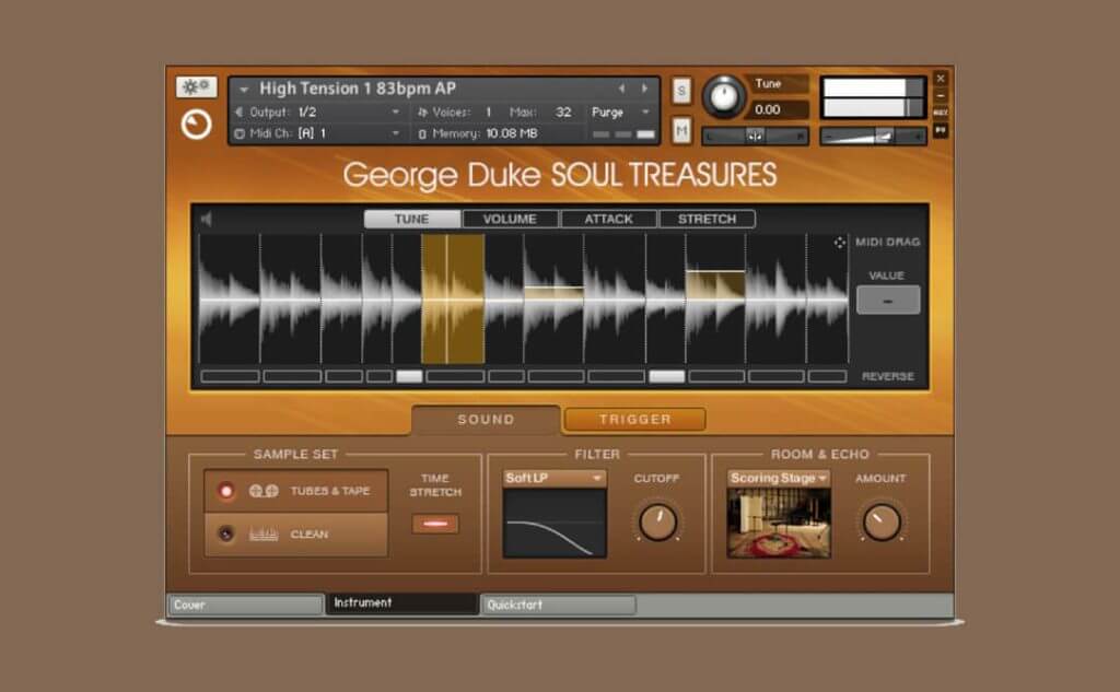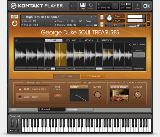 The heart of George Duke Soul Treasures lies in the vintage sound crafted by George Duke and his engineer Erik Zobler. The instrument features classic keyboard sounds, such as the Rhodes, Wurlitzer, and Clavinet pianos, recorded using high-end analog equipment. Each phrase has two versions: one clean and the other processed with the Tubes & Tapes chain. This signal path included sought-after analog outboard gear, a Requisite Audio tube optical limiter, and finally, the recording was done on an Ampex analog tape, adding that signature warm, soulful flavor to every note.