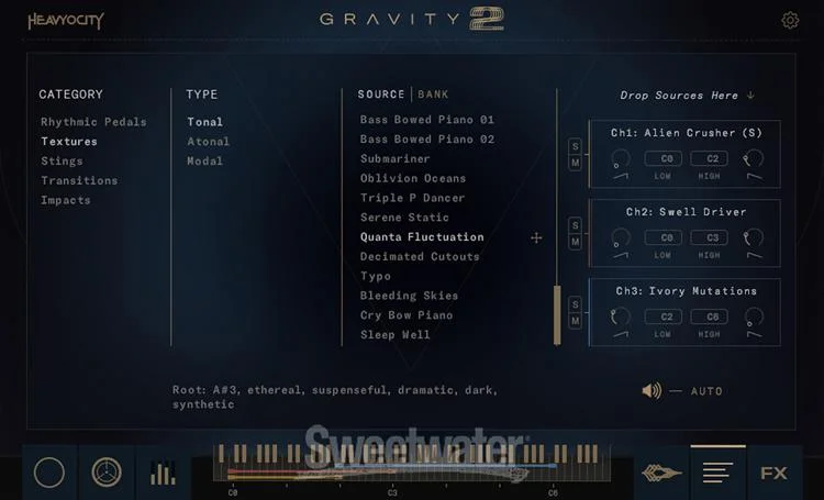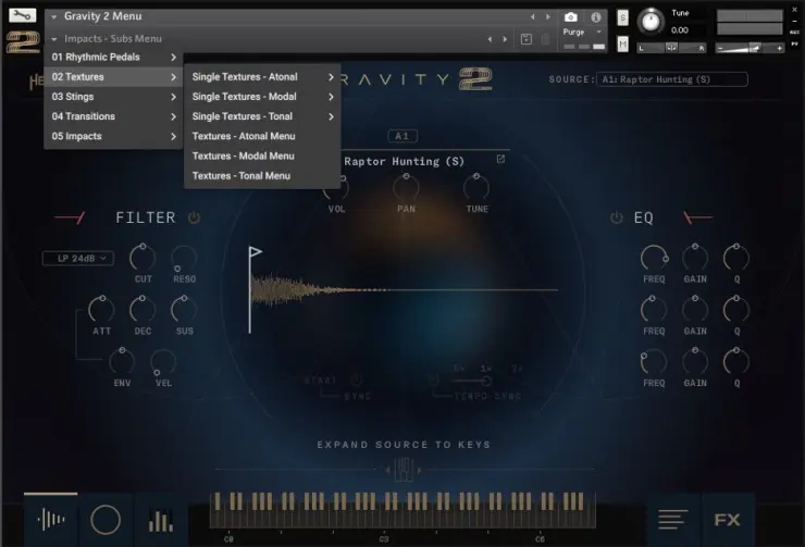 - 1,000+ snapshots (presets) across 5 different source categories: Rhythmic Pedals, Textures, Stings, Transitions, and Impacts