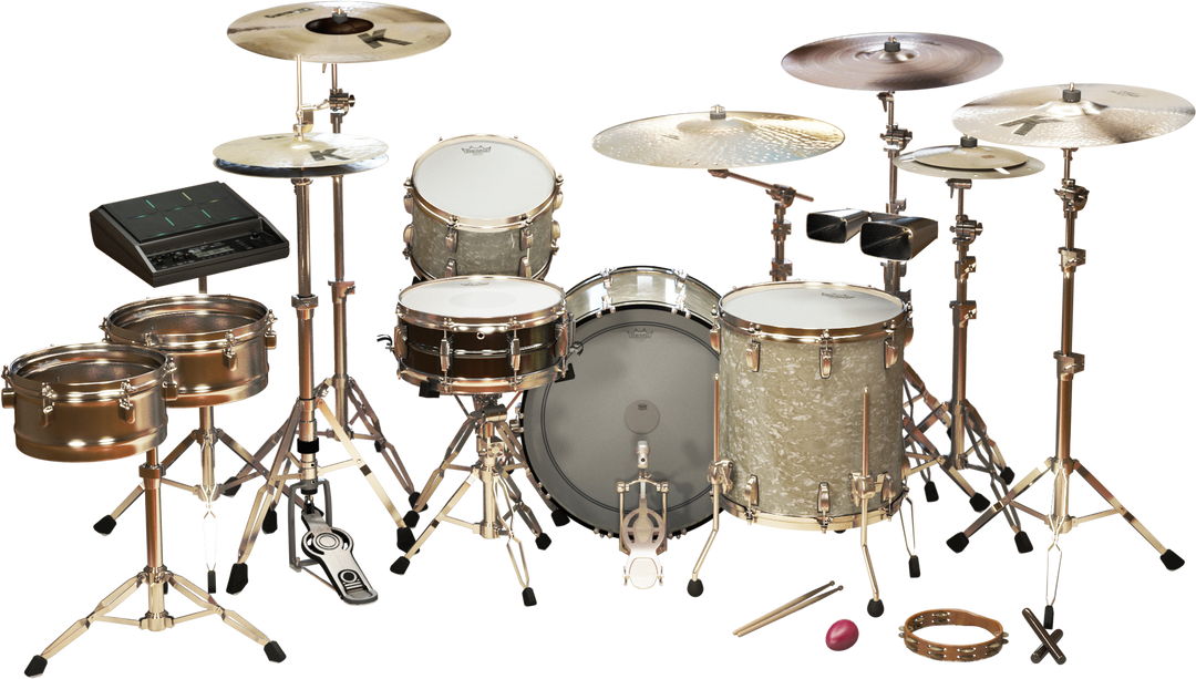 ✔ 4 snare options, 8 cymbals, and a variety of percussion pieces
