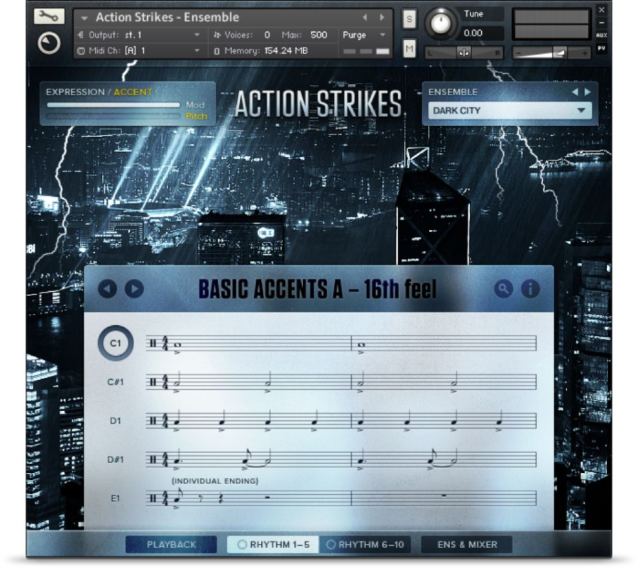 Action Strikes isn’t a generic loop library. It lets you freely combine 105 time-tested rhythms from 12 unique ensembles, each with five variations per section. In total, you have access to over 1,700 unique sonic combinations. Add to that the 65 single instruments and 32 playable rhythms, and you have endless possibilities for creating custom percussion parts.
