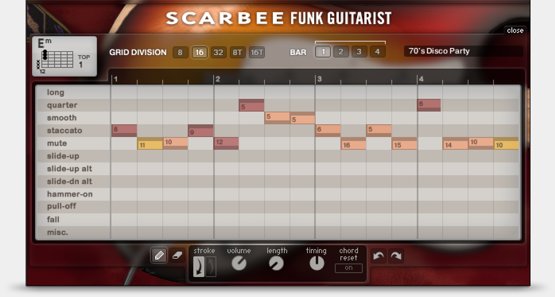 - Groove Editor: Manipulate individual elements of a groove and create custom funk riffs by combining articulations like up and down strokes, muted strums, hammer-ons, and slides.