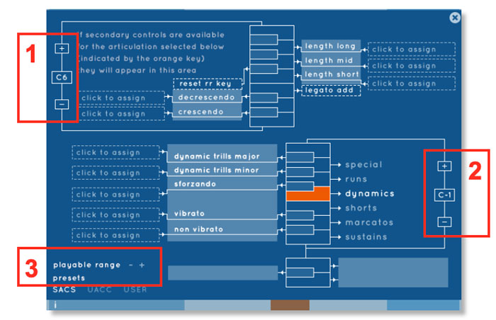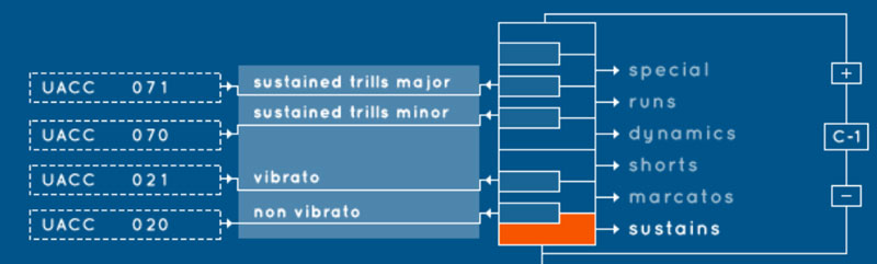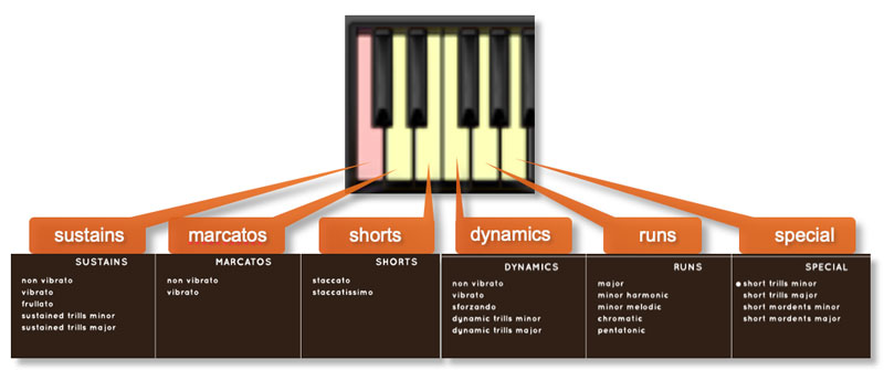With articulations grouped into six logical categories (sustains, marcatos, shorts, dynamics, runs, and specials), you can select a group with the white keys and then choose the specific articulation within that group using the black keys. Secondary controls (for marcato, dynamics, and runs) further enhance performance flexibility. - Advanced Mapping & Automation: