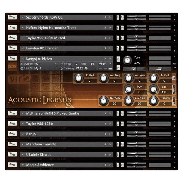 Designed for use in Kontakt Player, Acoustic Legends HD is perfect for multitimbral use, supporting up to 64 instruments simultaneously, making it ideal for film scoring, pop and acoustic productions, or any genre needing a rich acoustic sound.